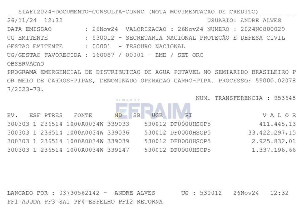 A pasta remanejou o valor de R$ 38.096.775,00 para que o Exército Brasileiro, faça realização dos pagamentos da Operação Carro-Pipa, que leva água potável para municípios localizados na região semiárida do Nordeste.
