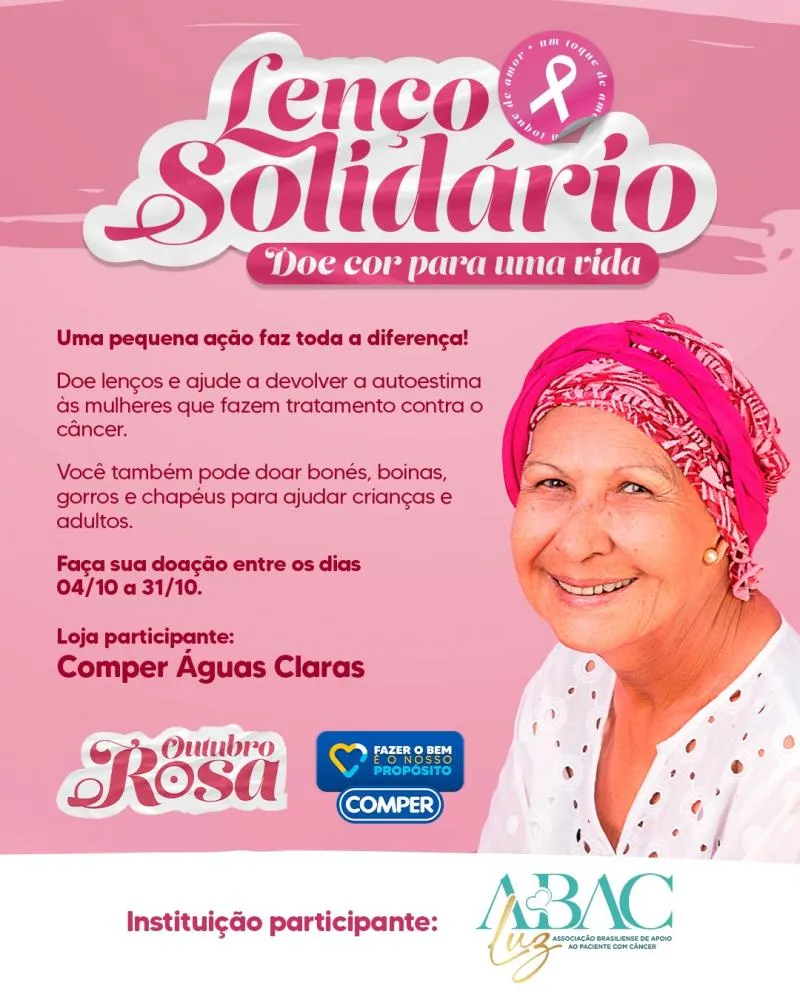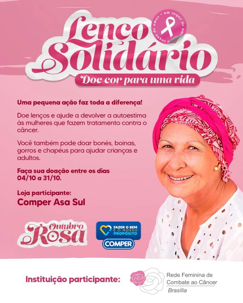 A campanha, que se estende além do câncer de mama, arrecada lenços, bandanas, toucas, bonés, boinas, chapéus e turbantes para homens e mulheres em tratamento oncológico. Criada em 2014 pela rede de supermercados Comper, a iniciativa este ano foi lançada em 4 de outubro e vai até o dia 31 de outubro, com a entrega dos itens arrecadados para a ABAC Luz e para a Rede Feminina de Brasília, instituições beneficiadas no Distrito Federal.