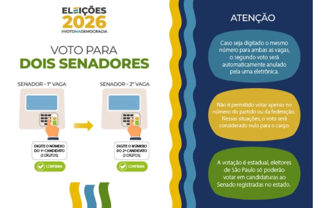 Além disso, a votação é estadual, o que significa que cada eleitora e eleitor só pode votar em candidatos que concorrem pelo seu estado de domicílio eleitoral. Ou seja: eleitoras e eleitores de São Paulo só poderão votar em candidaturas ao Senado registradas no estado. Votos eventualmente digitados para candidatos de outras unidades da Federação não serão computados.